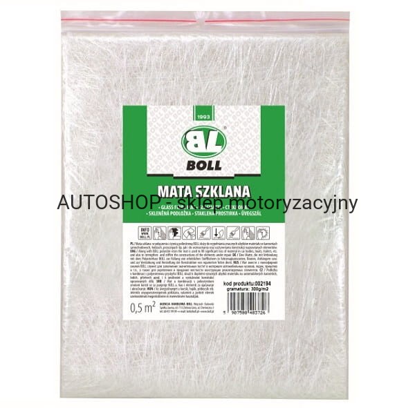 Mata w połączeniu z żywicą poliestrową BOLL służy do wypełniania znacznych ubytków materiału w karoseriach samochodowych, łodziach, przyczepach itp. jak i do wzmacniania i usztywniania konstrukcji naprawianych elementów. Dostępne gramatury: 150, 300, 450g/m2. Wymiar 0,5m2.