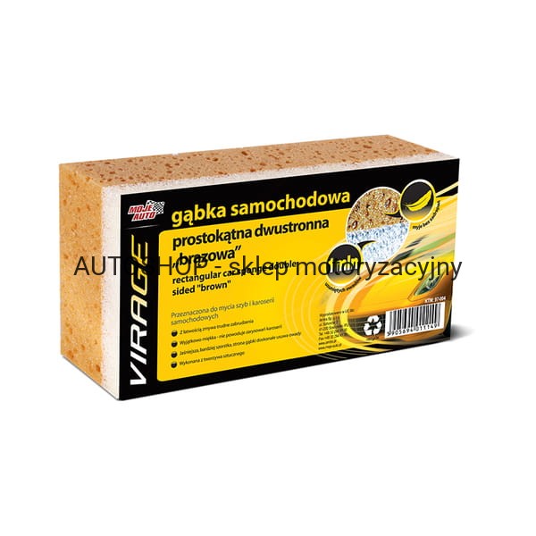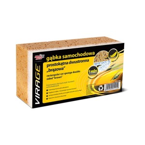 Uniwersalna gąbka przeznaczona do mycia szyb i karoserii samochodowych (strona brązowa), jaśniejsza strona gąbki przeznaczona do zmywania owadów z karoserii i szyb samochodowych.