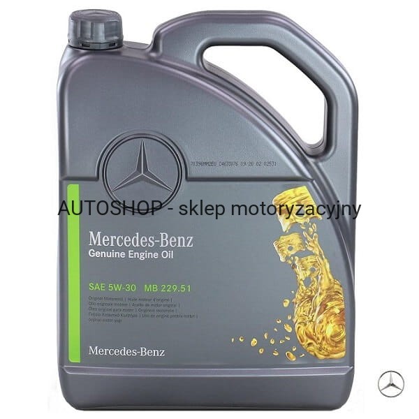 Oryginalny syntetyczny olej silnikowy Mercedes-Benz 5W30 MB 229.51, specjalnie opracowany do najnowszych samochodów Mercedes-Benz. Zalecany do silników benzynowych i wysokoprężnych z turbodoładowaniem dedykowany do samochodów z filtrem cząstek stałych (DPF)