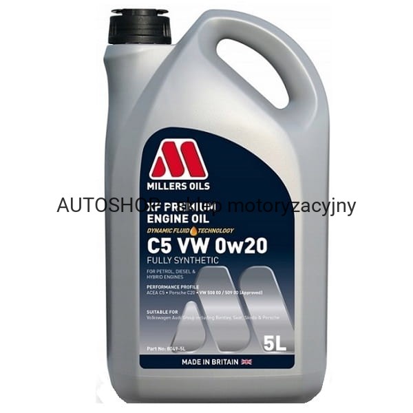 Olej silnikowy klasy premium, posiadający oryginalną aprobatę producenta samochodów (OEM), opracowany przy użyciu technologii Millers Oils Dynamic Fluid Technology (DFT). Nadaje się do stosowania w nowoczesnych silnikach wymagających oleju typu 0w20 ACEA C5. Przygotowany specjalnie dla Grupy Volkswagen Audi (VAG), w tym Bentley, Seat, Skoda i Porsche. Jest w pełni kompatybilny z systemami i normami oczyszczania spalin – DPF (filtr cząstek stałych), GPF (filtr cząstek stałych w benzynie) i katalizatorami. Do stosowania w silnikach benzynowych, wysokoprężnych i hybrydowych, w tym w typowych pojazdach hybrydowych z samoczynnym ładowaniem (HEV) jak i hybrydowych pojazdach typu plug-in (PHEV).
