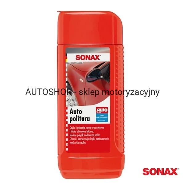 Sonax Auto Politura zawiera związki polimerowe, wosk Carnauba oraz cząsteczki ścierne, związki te czyszczą lakier, ożywiają kolory, nadają karoseri połysk i dodatkowo tworzą warstwę ochronną,