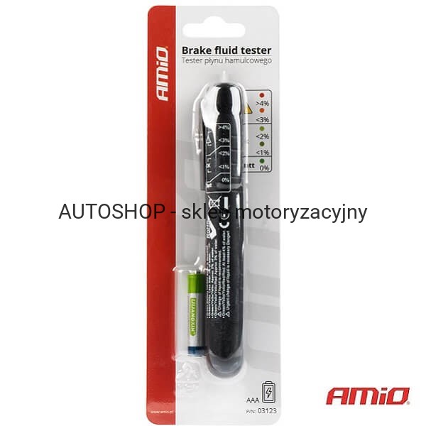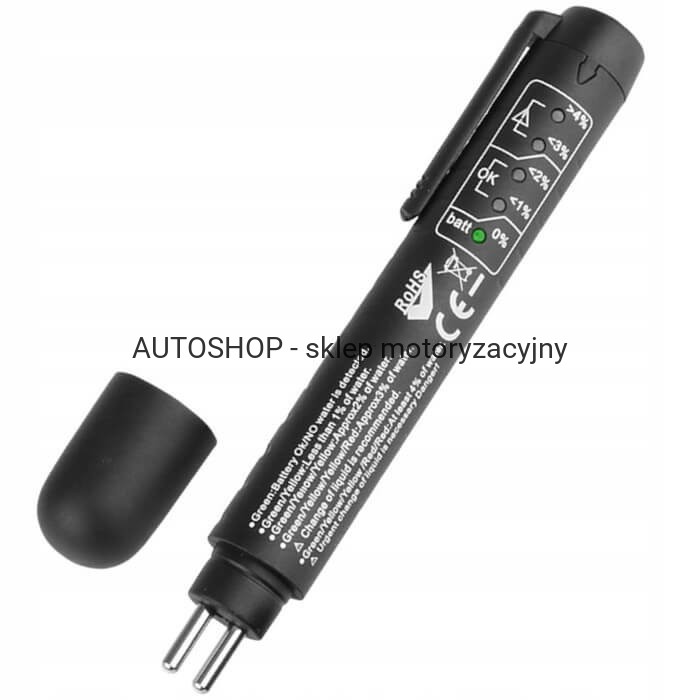 Kompaktowy tester płynu hamulcowego. Umożliwia błyskawiczny pomiar zawartości wody w płynie hamulcowym, niezależnie od posiadanego modelu samochodu. Wystarczy zanurzyć elektrody testera w zbiorniczku z płynem hamulcowym i odczytać wskazanie diod kontrolnych. Urządzenie jest w stanie przetestować wiele rodzajów płynów hamulcowych (DOT 3, DOT 4, DOT 5, DOT 5.1).