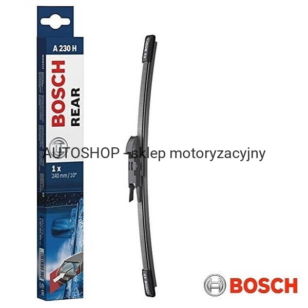 Bosch Rear - seria klasycznych piór wycieraczek do tylnej szyby samochodu. Konstrukcja przegubowa, z dwuskładnikową gumą pióra. Nie są to wycieraczki uniwersalne ale dedykowane do konkretnego auta. Wycieraczka Bosch Rear A230H przypomina kształt i spełnia funkcję oryginalnego wyposażenia producenta pojazdu. Wycieraczki mogą mieć plastikową lub metalową konstrukcję, a łączniki z ramieniem są wyspecjalizowane lub przygotowane do połączenia na ,,hak".