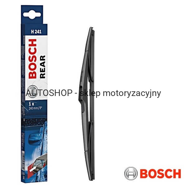 Bosch Rear - seria klasycznych piór wycieraczek do tylnej szyby samochodu. Konstrukcja przegubowa, z dwuskładnikową gumą pióra. Nie są to wycieraczki uniwersalne ale dedykowane do konkretnego auta. Wycieraczka Bosch Rear H241 przypomina kształt i spełnia funkcję oryginalnego wyposażenia producenta pojazdu. Wycieraczki mogą mieć plastikową lub metalową konstrukcję, a łączniki z ramieniem są wyspecjalizowane lub przygotowane do połączenia na ,,hak".