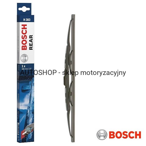 Bosch Rear - seria klasycznych piór wycieraczek do tylnej szyby samochodu. Konstrukcja przegubowa, z dwuskładnikową gumą pióra. Nie są to wycieraczki uniwersalne ale dedykowane do konkretnego auta. Wycieraczka Bosch Rear H383 przypomina kształt i spełnia funkcję oryginalnego wyposażenia producenta pojazdu. Wycieraczki mogą mieć plastikową lub metalową konstrukcję, a łączniki z ramieniem są wyspecjalizowane lub przygotowane do połączenia na ,,hak".