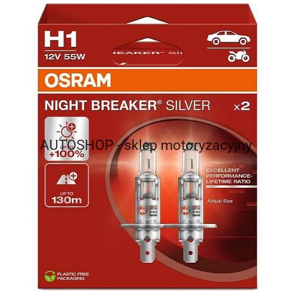Żarówka H1 Osram Night Breaker Silver, 55W to wysokowydajna żarówka halogenowa o optymalizowanej żywotności.